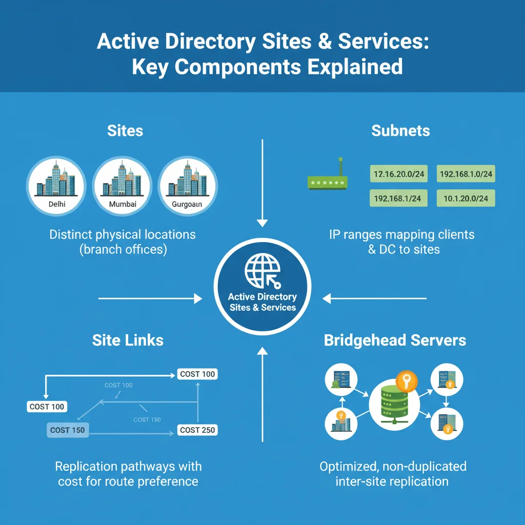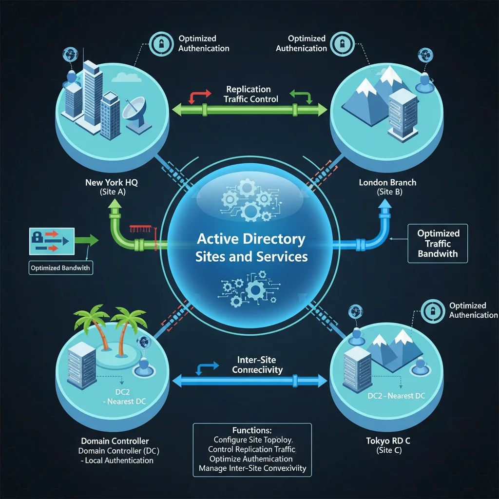 Active Directory Sites and Services is a powerful Microsoft console that allows administrators to define site topology, control replication, and manage authentication traffic across multiple domain controllers. Understanding this concept is essential when working in organizations that operate from multiple offices or geographic locations.