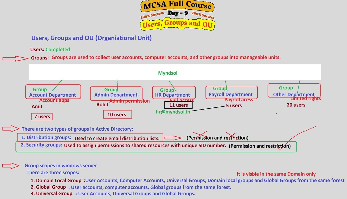 - Security Groups: These groups are used to assign permissions to shared resources. When a user is part of a security group, they can access resources that the group has permissions for.