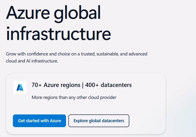 Microsoft Azure has a massive global infrastructure with over 400 data centers spread across 70+ regions, making it the largest cloud provider by footprint, continuously expanding to meet AI and enterprise demands with dedicated GPU capacity and advanced cooling. These data centers form “regions” and “availability zones,” providing high availability and low latency worldwide, with Microsoft adding many new facilities each year