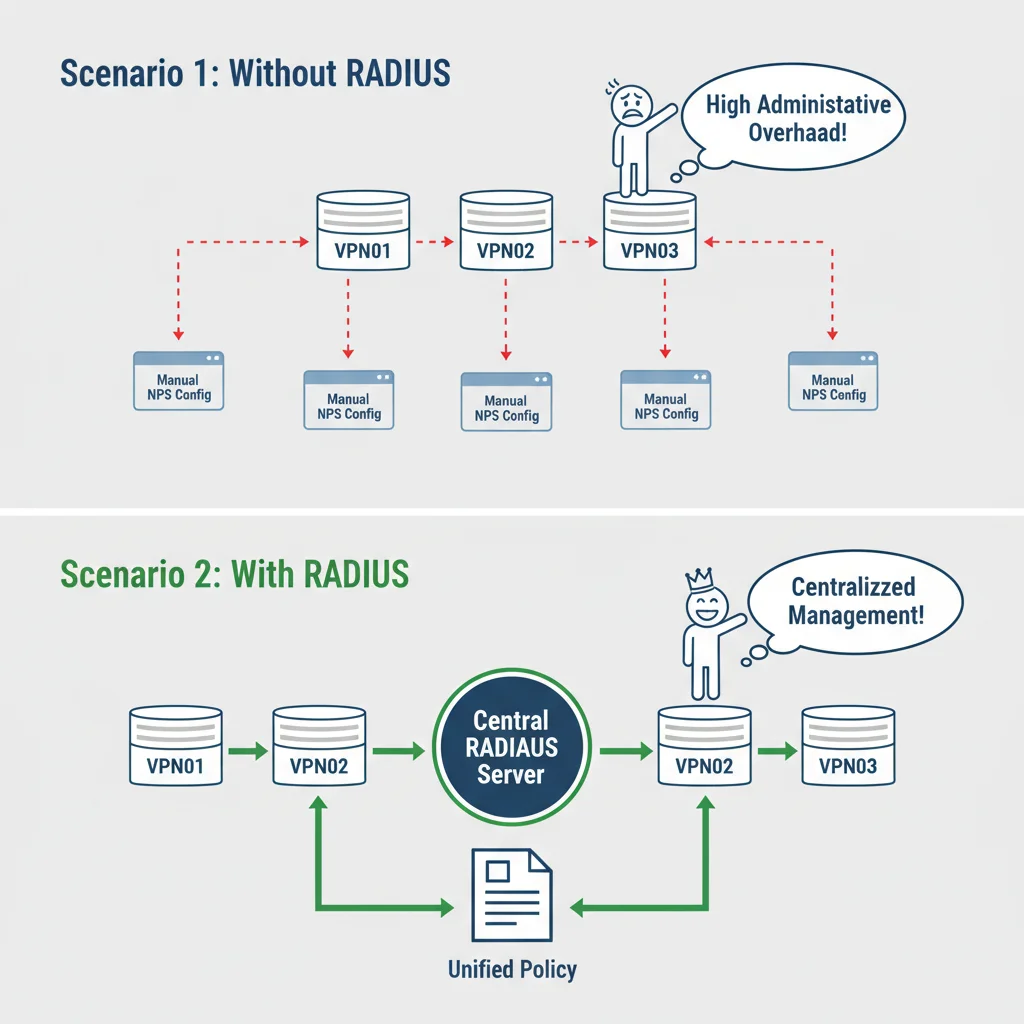 - Without RADIUS: Each VPN needs manual NPS configuration.