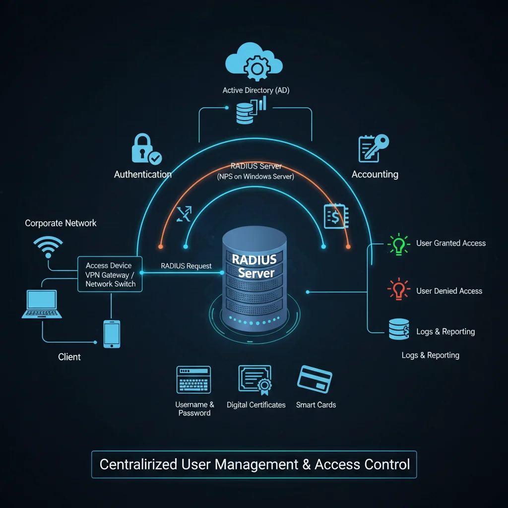 In Windows Server, RADIUS is implemented through NPS (Network Policy Server). This allows administrators to enforce access policies and integrate with Active Directory for centralized user management.